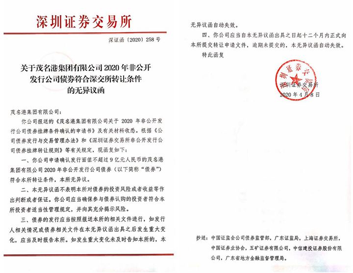 4月8日,茂名港集團有限公司收到深圳證券交易所同意發(fā)行9億元非公開公司債的無異議函,這意味著集團本輪9億元非公開公司債券申報工作圓滿成功。這是集團繼2019年9月成功發(fā)行3億元非公開公司債后,再次通過發(fā)行公司債成功獲得融資。