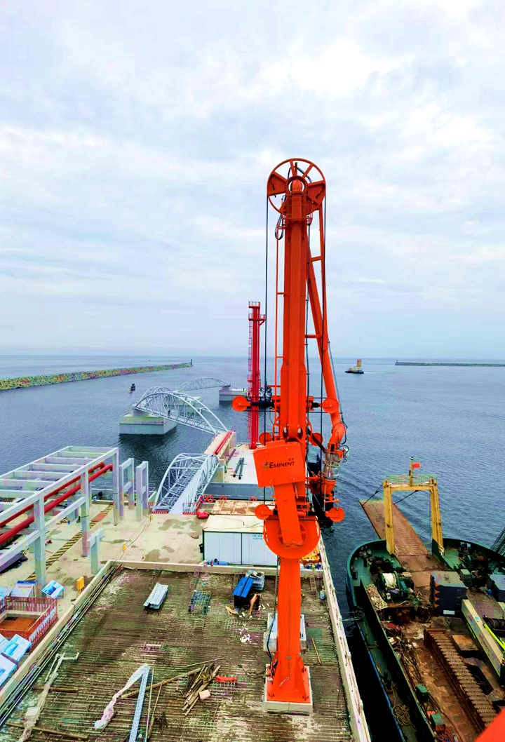 此次安裝的4臺裝卸臂堪稱碼頭“大動脈”,每臺高23.3米、重41.83噸,采用電/液驅(qū)動技術(shù),具備高效、安全、穩(wěn)定的輸油能力,全部投用后,每年可助力完成1650萬噸原油輸送任務,將大幅提升茂名港原油接卸與中轉(zhuǎn)效率。同步安裝的具有浮動功能的登船梯高26.5米、重約32噸,根據(jù)潮汐自動調(diào)節(jié)梯高度的智能設計,為10萬到30萬噸級的船舶提供了安全便捷的通道;2座高29米的消防炮塔上的消防水炮最大覆蓋半徑達99米,其射程遠、流量大,如同“安全衛(wèi)士”構(gòu)筑起碼頭前沿的安全保障網(wǎng)。